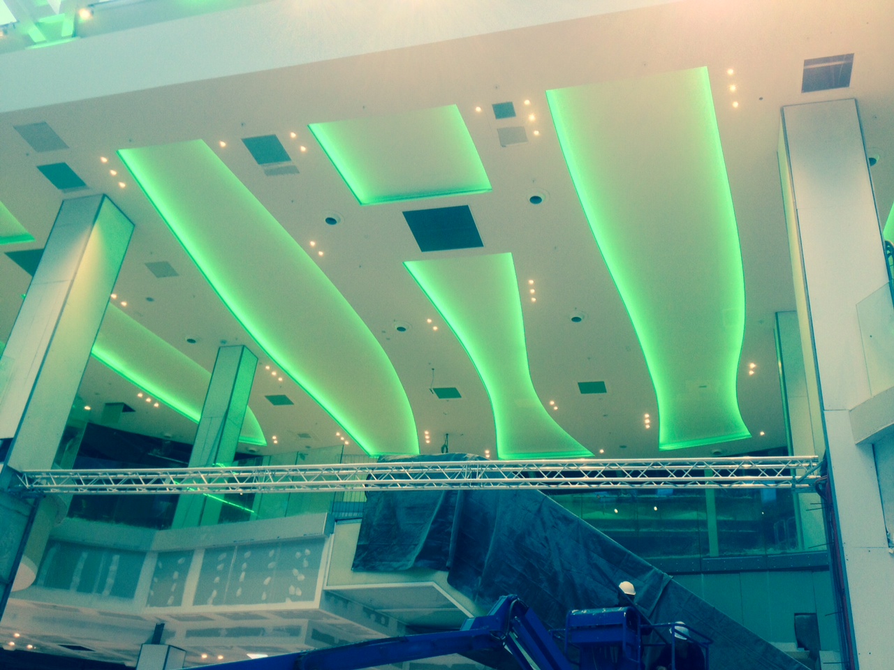 comme de nuit, dans un délai très tendu, au cœur d’un centre commercial très fréquenté, et restant en exploitation pendant toute la durée des travaux.